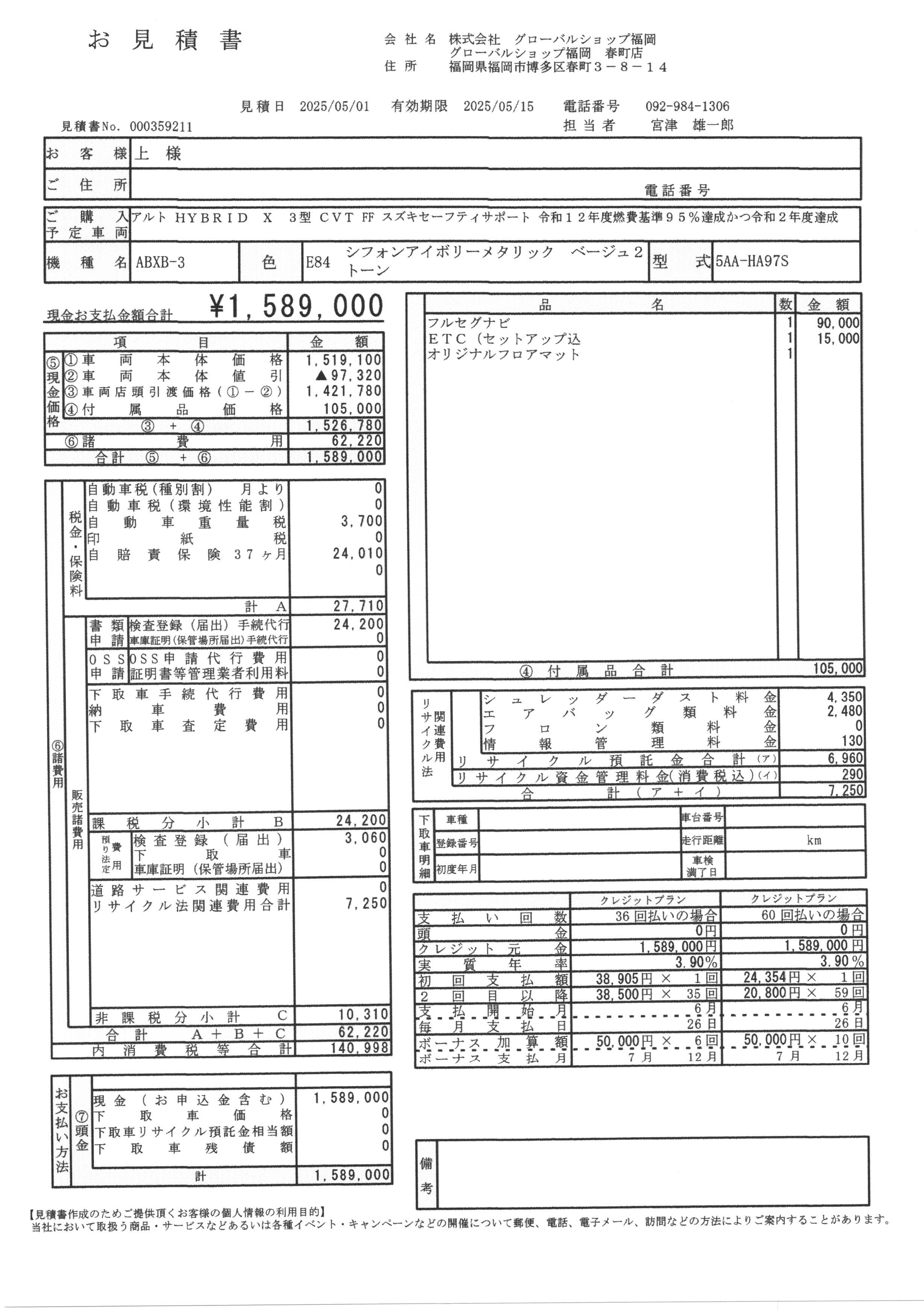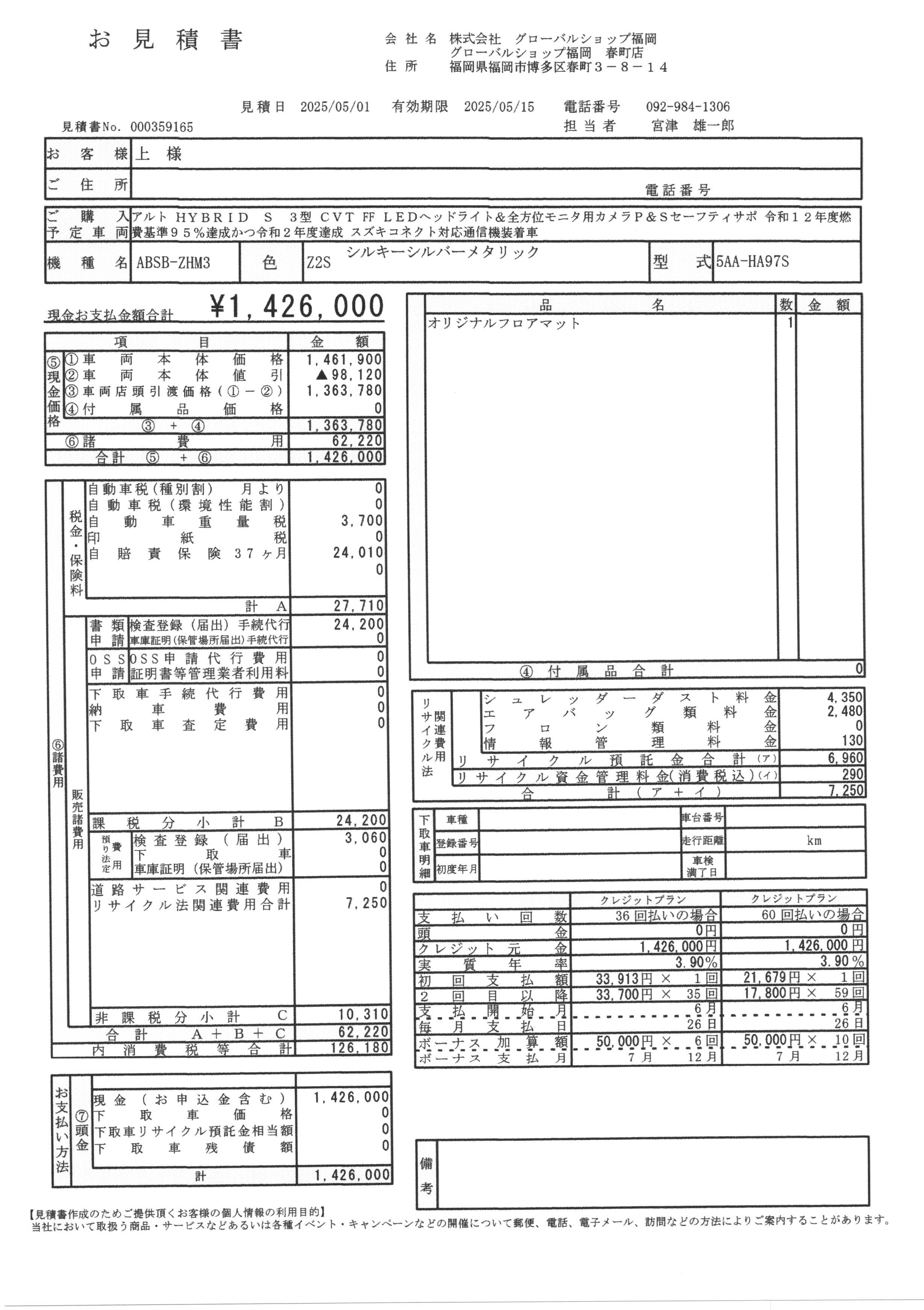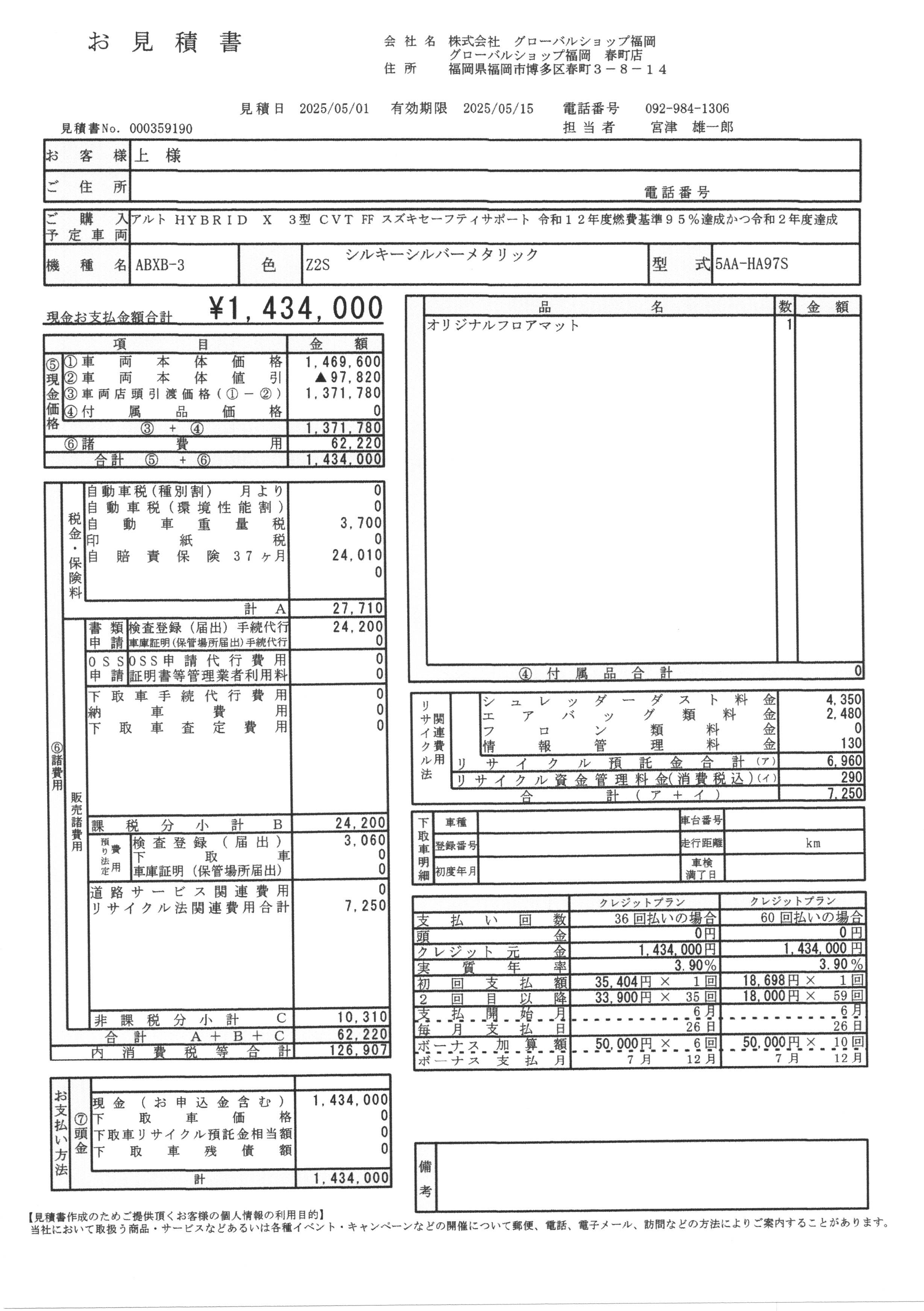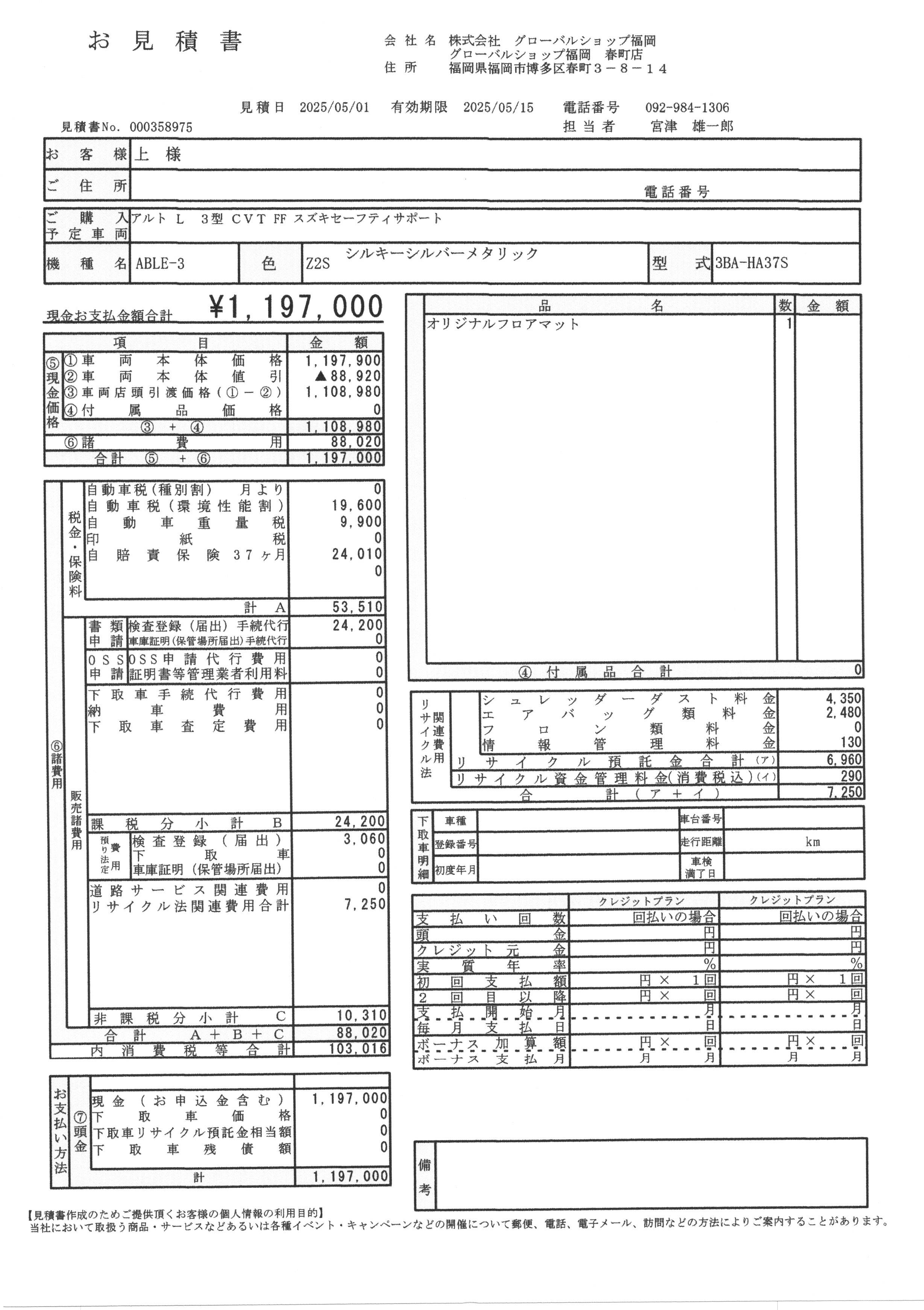 車輌本体のお支払総額は下記のお見積書のように