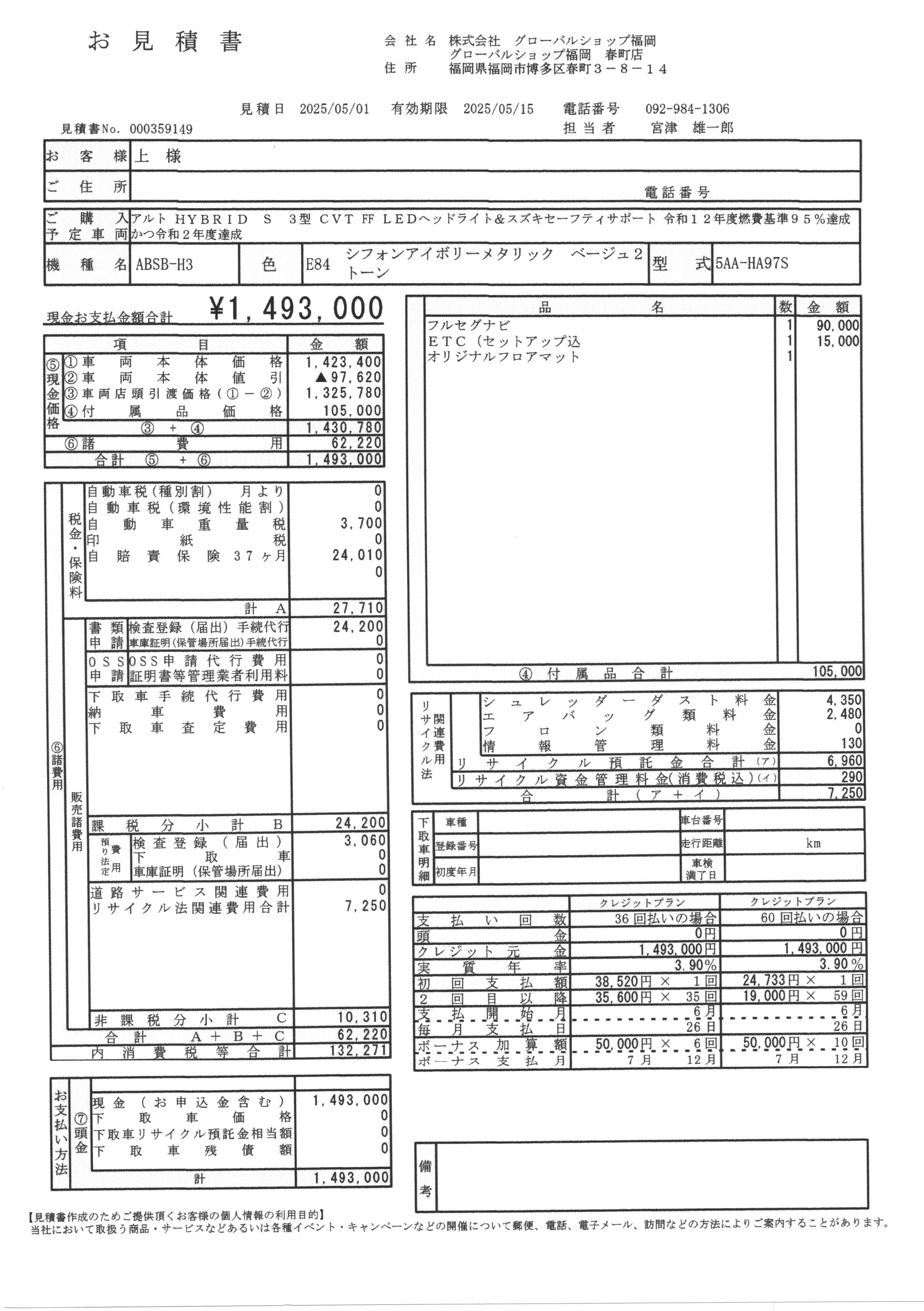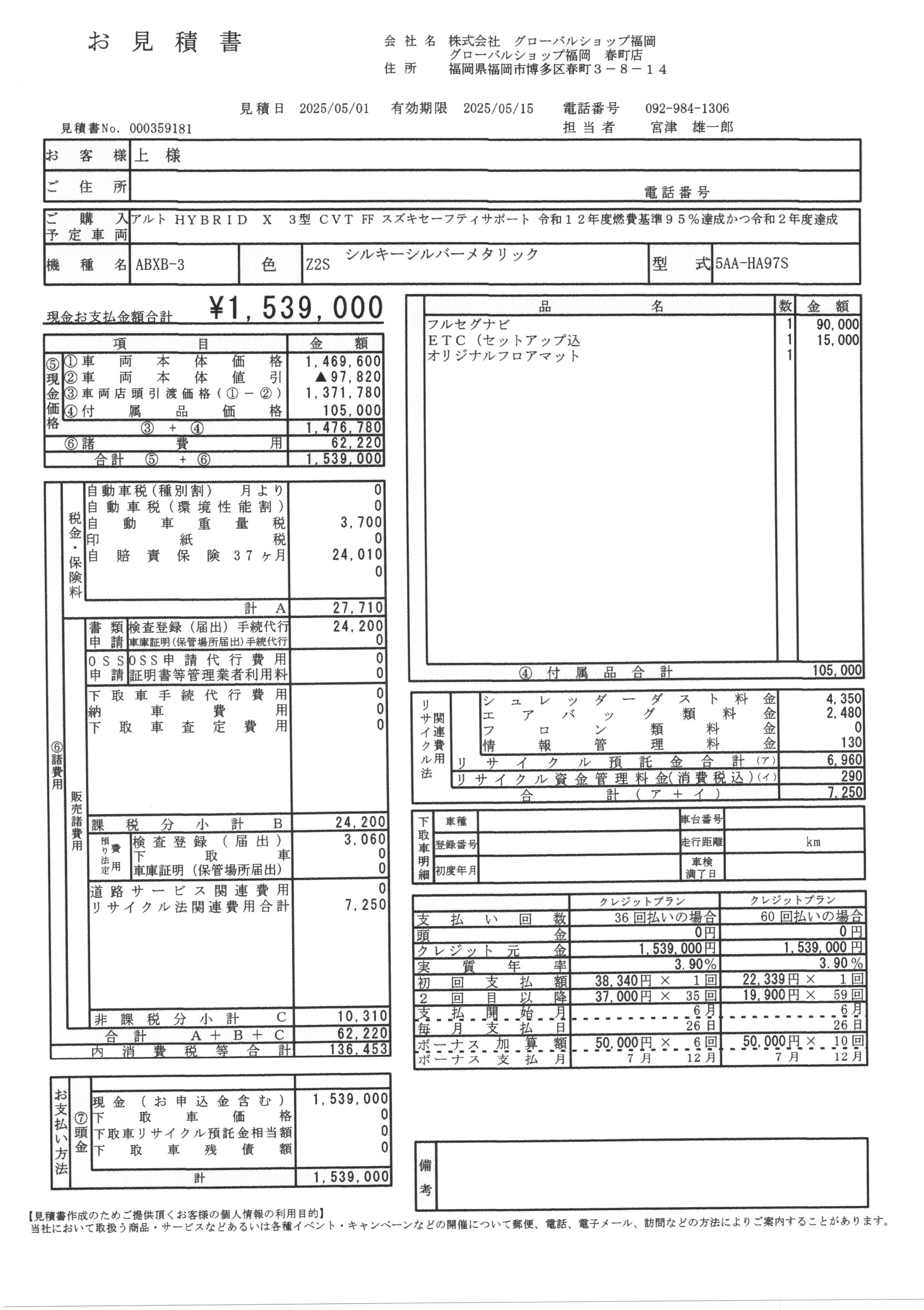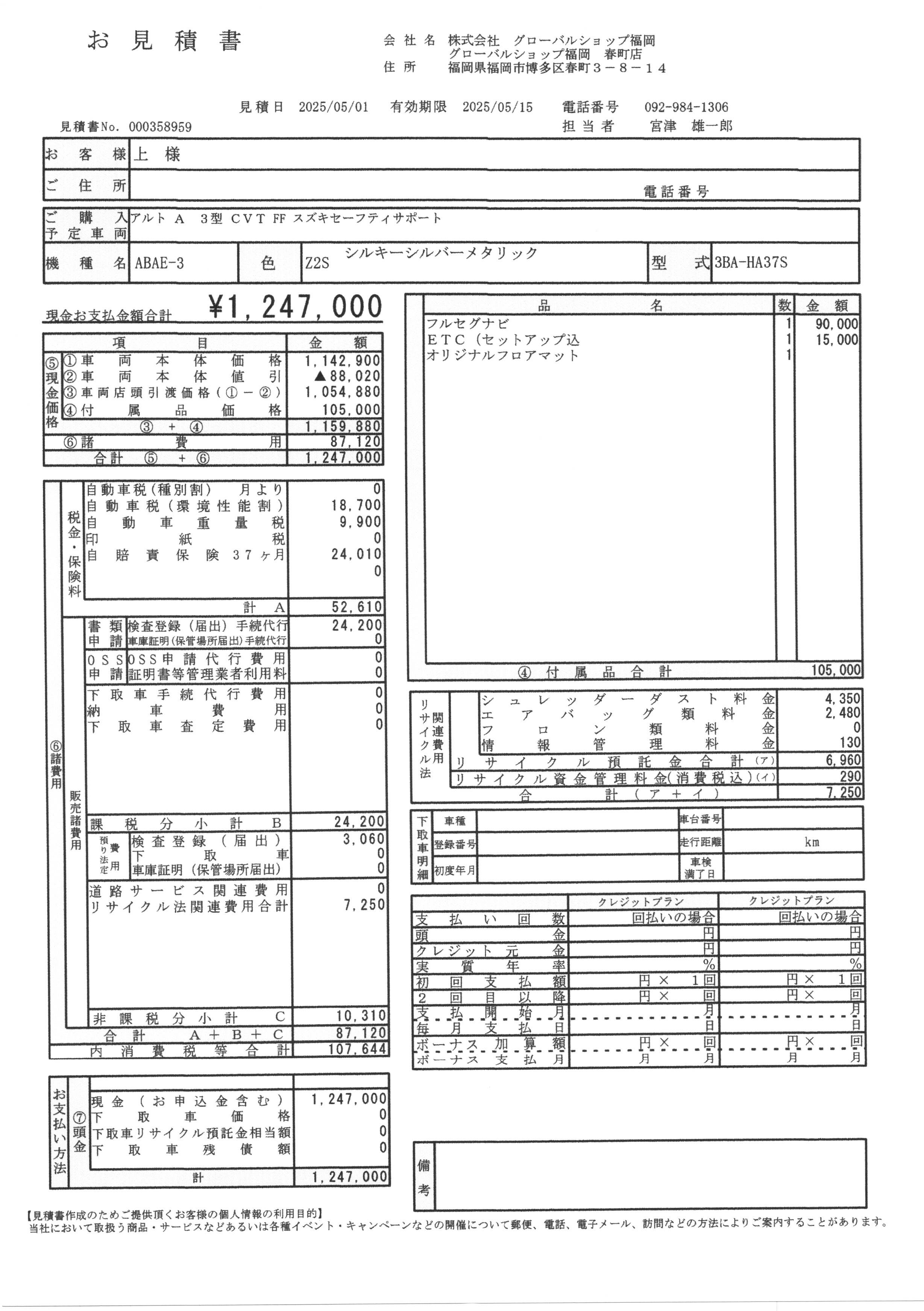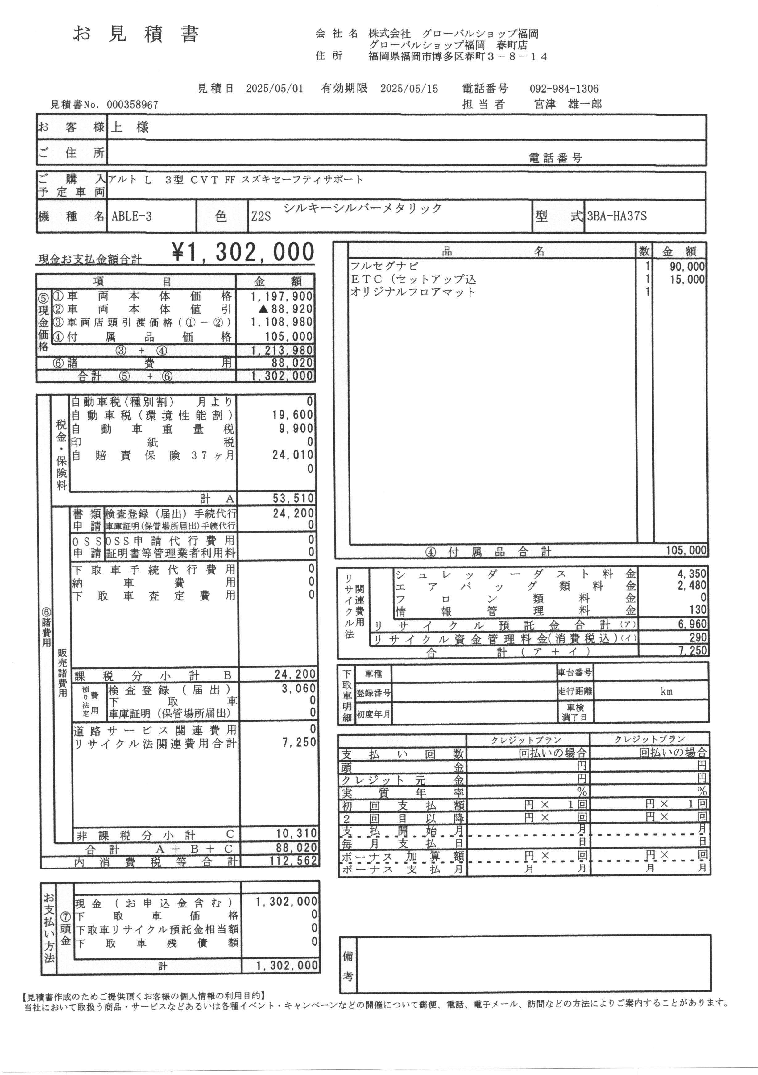 車輌本体のお支払総額は下記のお見積書のように